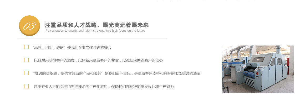太倉市高陽工貿(mào)有限公司是專業(yè)從事特種紗生產(chǎn)十?dāng)?shù)年的一線生產(chǎn)廠家,坐落于江蘇省蘇州市太倉市雙鳳鎮(zhèn)新湖建湖路29號,太倉隸屬長江三角洲經(jīng)濟圈,交通便捷,經(jīng)濟發(fā)達,是著名的紡織生產(chǎn)基地。 公司歷史要追溯到1982年就成立的新湖毛紡織廠。1996年,毛紡織廠與上海二十二棉在新湖聯(lián)合組建了太倉市新湖福利綜合廠。2002年為適應(yīng)市場的飛速變化,公司轉(zhuǎn)制重組更名為太倉市高陽工貿(mào)有限公司。同時公司適時調(diào)整生產(chǎn)經(jīng)營策略,調(diào)整產(chǎn)品品種結(jié)構(gòu),把生產(chǎn)特種紗作為主要發(fā)展方向,純棉、滌綸竹節(jié)紗是我們的主要產(chǎn)品。 公司多年來始終保持了持續(xù)穩(wěn)定發(fā)展的良好勢頭,在激烈的市場競爭中發(fā)展壯大,不斷前行。我們把“走品牌發(fā)展之路,創(chuàng)紗線知名商標(biāo)”作為公司持續(xù)發(fā)展的核心戰(zhàn)略。以市場為導(dǎo)向,堅持“以品種求發(fā)展,以質(zhì)量求生存”的方針,以增強市場競爭力為中心,對不斷變化的市場環(huán)境作出快速反應(yīng),品牌戰(zhàn)略的實施。公司注重專業(yè)人才的引進和先進技術(shù)的生產(chǎn)化應(yīng)用,具備較強的研發(fā)設(shè)計和生產(chǎn)能力。 公司一直把“品質(zhì)、創(chuàng)新、誠信”作為企業(yè)文化建設(shè)的核心。以品質(zhì)來獲得客戶的滿意,以創(chuàng)新來贏得客戶的贊賞,以誠信來博得客戶的信心。我們把“準(zhǔn)時的交貨期,提供零缺點的產(chǎn)品和服務(wù)”作為奮斗目標(biāo),贏得了客戶的支持和良好的市場信譽。 高陽工貿(mào)有限公司愿與廣大客戶加強合作,共享信息,迎接挑戰(zhàn),共同發(fā)展。客戶需求。了解詳細(xì)>>